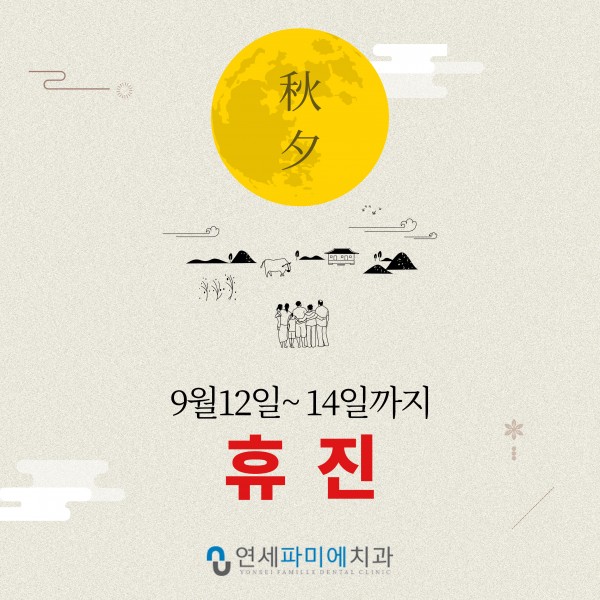 이전글 다음글 목록 추석연휴 일정입니다! 2019-08-24 조회수 1,720 본문 안녕하세요! 연세파미에치과입니다. 추석연휴 일정을 미리 공지합니다!9월 12일~14일은 추석입니다!연세파미에치과는 위의 연휴기간동안 휴진입니다!참고하시어, 예약 및 방문에 차질이 없으시길 바랍니다! 감사합니당! *9월 16일부터 정상진료 입니다! 이전글 다음글 목록