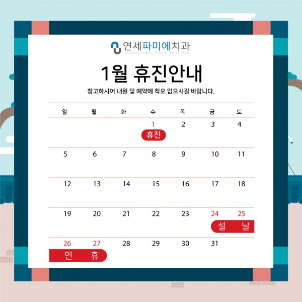 이전글 다음글 목록 1월 휴진일 안내 :) 2019-12-30 조회수 1,605 본문 안녕하세요.연세파미에치과입니다. 2020년 1월 일정을 공지합니다.1월 1일과 설 연휴는 모두 휴진입니다.(대체 휴무일 포함) 이점 유의하시어 내원 및 예약에착오 없으시길 바랍니다. 즐거운 연휴 보내세요!감사합니다. 이전글 다음글 목록