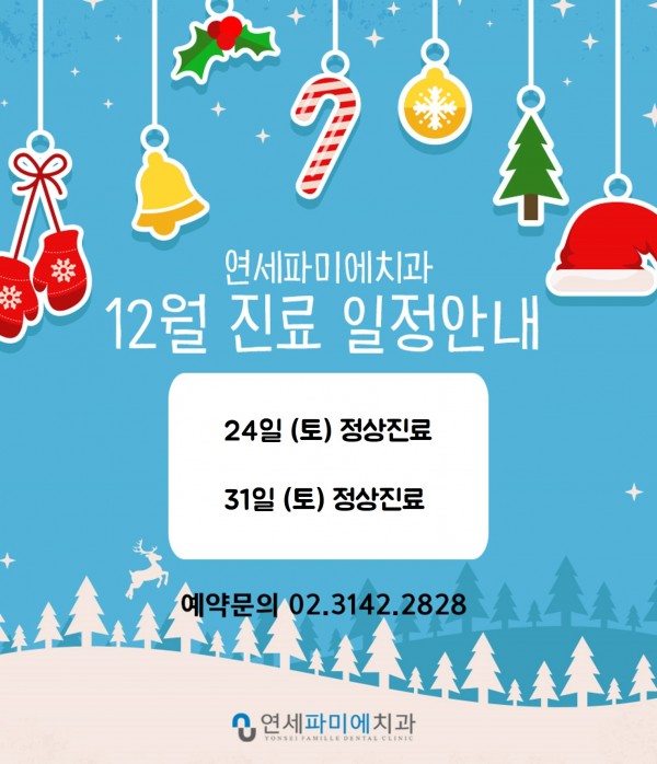 이전글 다음글 목록 12월 진료안내 2016-11-30 조회수 2,158 본문 안녕하세요. 홍대 연세파미에치과의원의 12월 진료일정을 안내해드립니다.12월 24일(토), 31일(토) 정상진료입니다. 참고하셔서 병원 이용에 불편이 없으시길 바랍니다. 예약문의 02-3142-2828 이전글 다음글 목록